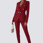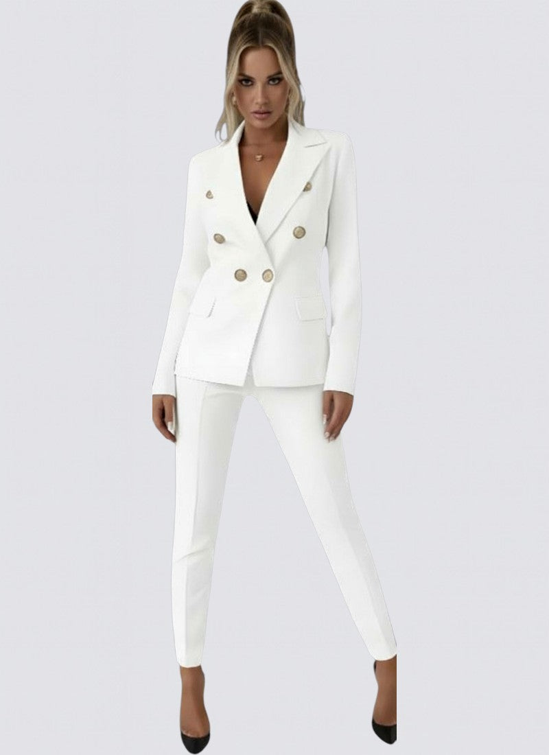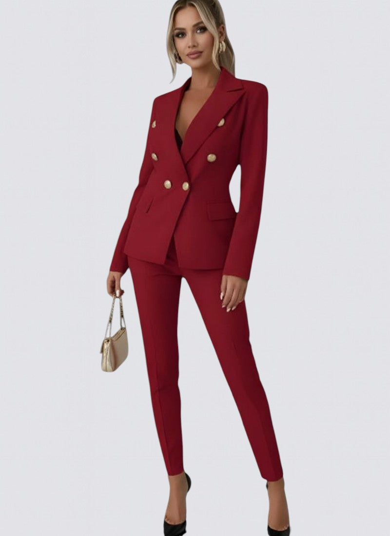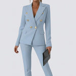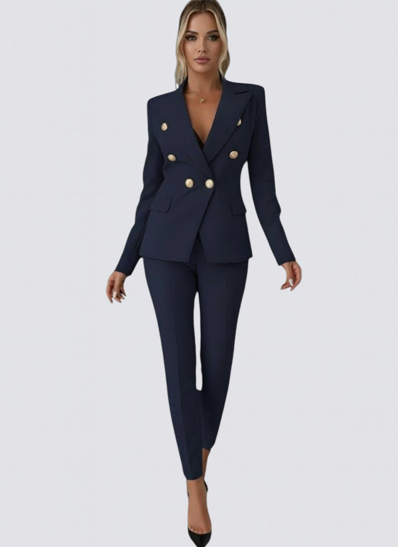 Sofisticirani komplet stvoren za žene koje žele izgledati profesionalno i samouvjereno. Dvoredni sako s dekorativnim gumbima oblikuje struk i daje savršenu strukturu, dok uske hlače cigareta kroja, dužine do gležnja, vizualno izdužuju siluetu. Udobna tkanina s blagim rastezanjem prati pokret i zadržava besprijekoran izgled od jutra do večeri. Džepovi s preklopom i čisti kroj čine ga idealnim za ured, sastanke i svečane prilike — nosite ga kao komplet ili odvojeno.