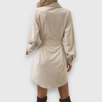 Haljina Marina kombinira trendi izgled od rebrastog baršuna s klasičnim oblikom košulje, dodajući elegantan, ali ležeran dodir vašem izgledu. S odgovarajućim remenom, struk je savršeno istaknut, dok džepovi s preklopom i jednobojna tkanina donose dodatni stil.