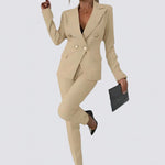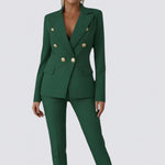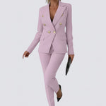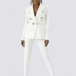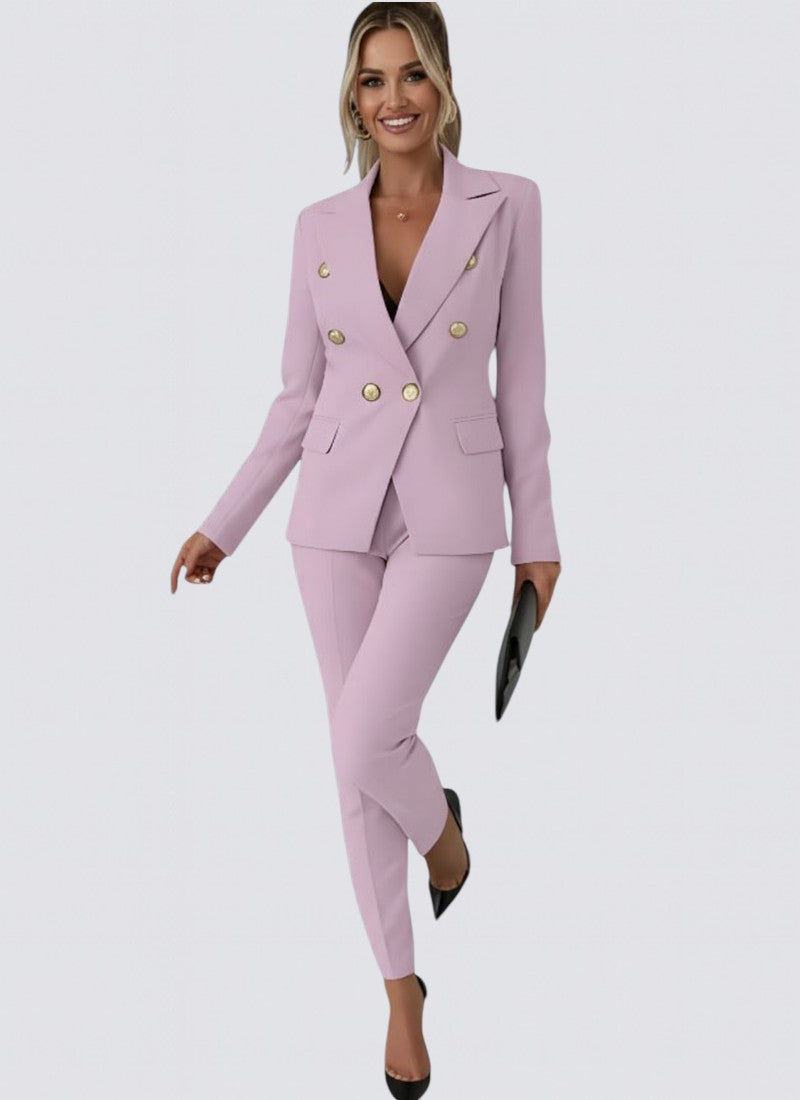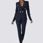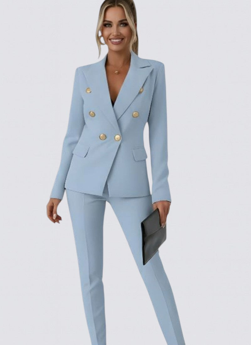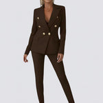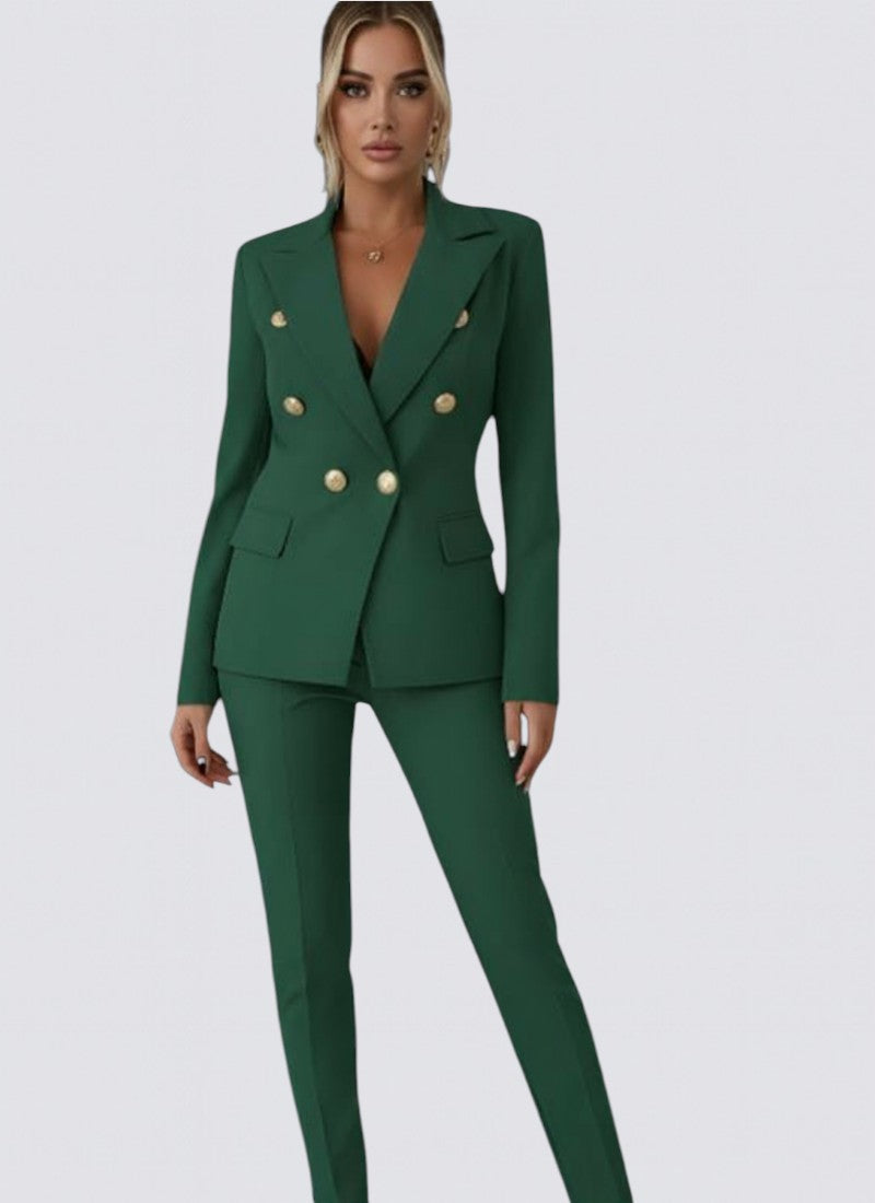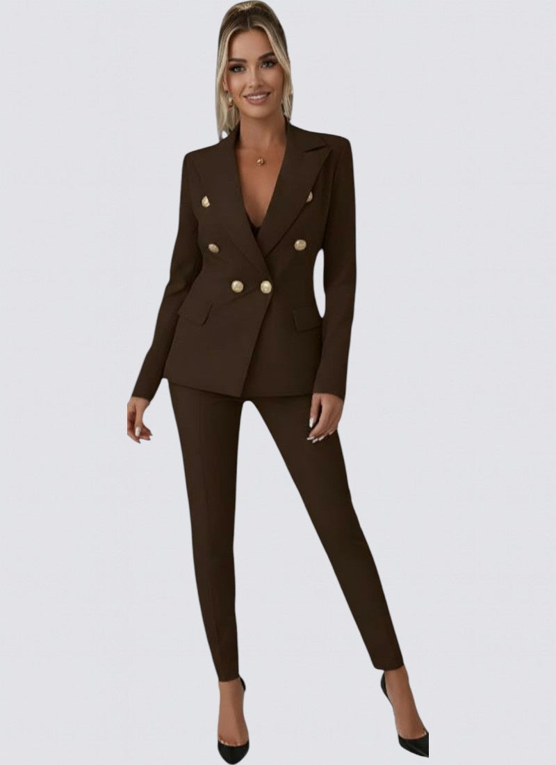 Sofisticirani komplet stvoren za žene koje žele izgledati profesionalno i samouvjereno. Dvoredni sako s dekorativnim gumbima oblikuje struk i daje savršenu strukturu, dok uske hlače cigareta kroja, dužine do gležnja, vizualno izdužuju siluetu. Udobna tkanina s blagim rastezanjem prati pokret i zadržava besprijekoran izgled od jutra do večeri. Džepovi s preklopom i čisti kroj čine ga idealnim za ured, sastanke i svečane prilike — nosite ga kao komplet ili odvojeno.