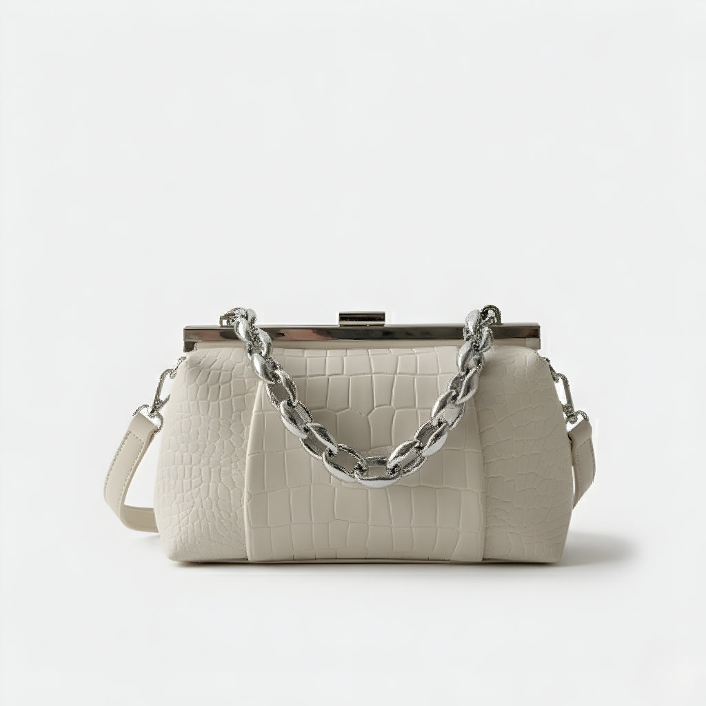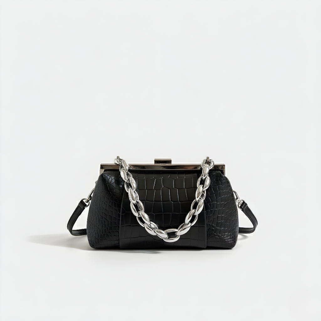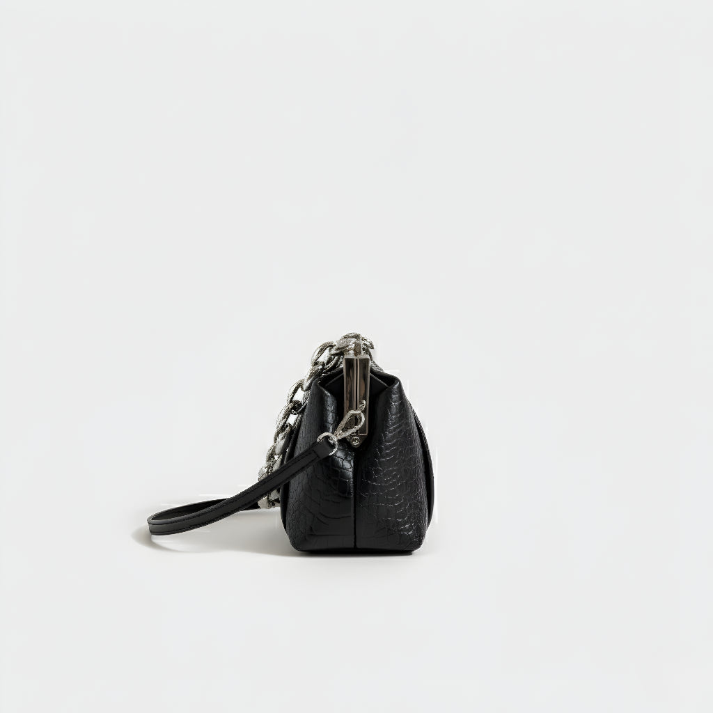 Sa teksturom krokodila i čvrstom strukturom, ova torba spaja sofisticiranost i osobnost u jednom dodatku. Njen klasični metalni zatvarač i robusna lančana ručka stvaraju modernu i upečatljivu kontrast. Idealna je za one koji traže kompaktni, praktični komad s jakom prisutnošću, bilo za dan ili noć.