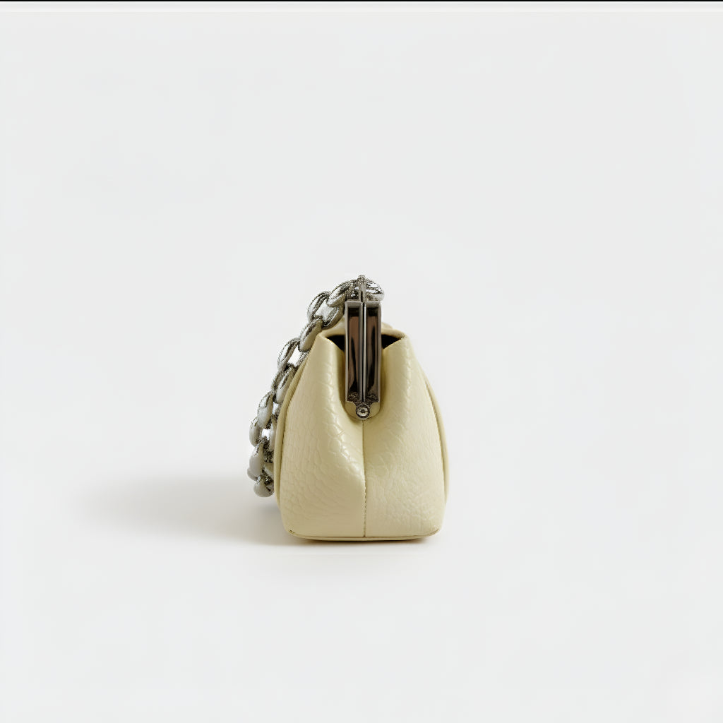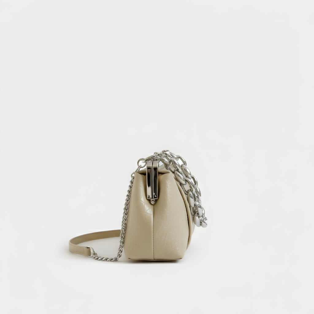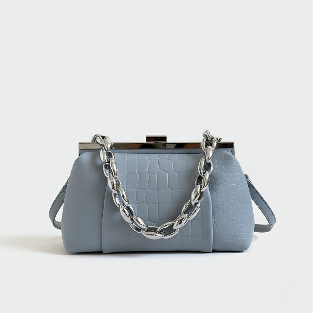 Sa teksturom krokodila i čvrstom strukturom, ova torba spaja sofisticiranost i osobnost u jednom dodatku. Njen klasični metalni zatvarač i robusna lančana ručka stvaraju modernu i upečatljivu kontrast. Idealna je za one koji traže kompaktni, praktični komad s jakom prisutnošću, bilo za dan ili noć.